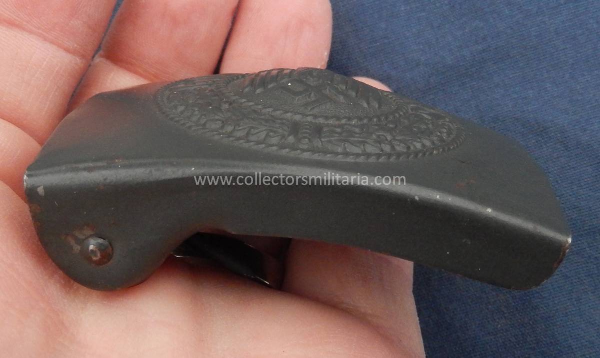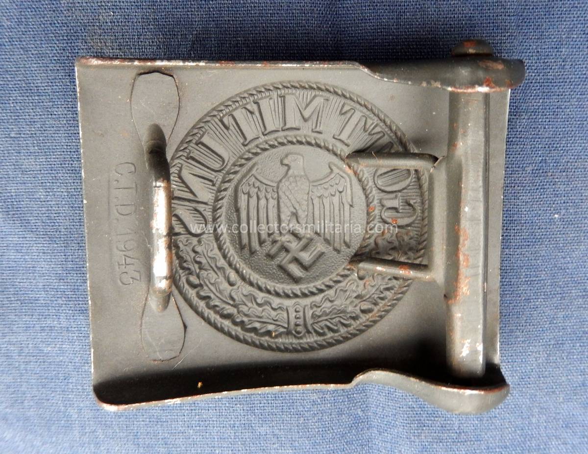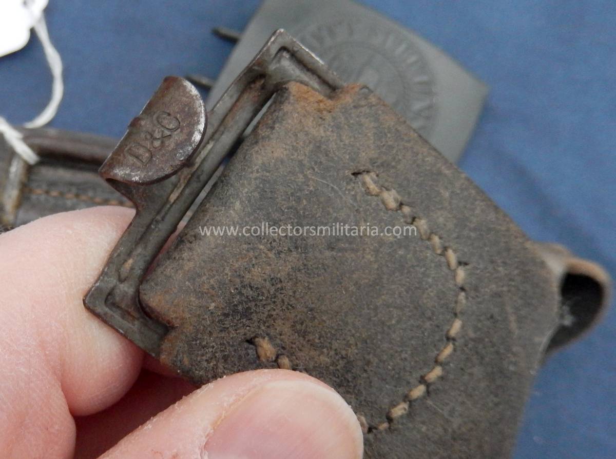 A WWII German kriegsmarine coastal artillery/ Heer belt and buckle set with ammo pouch. It is in nice condition and still retains most of its original paint. The buckle is steel with dark blue-grey paint. It is marked C.D.T. 1943 (Christian Theodore Dicke) on the back. The belt is size 100.
